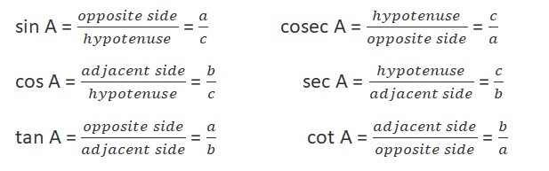 The ratios of different pairs of sides of the right angle are called trigonometric ratios of its acute angle with respect to angle A. The trigonometric ratios namely sine (sin), cosine (cos), tangent (tan), cosecant (cosec), secant (sec), and cotangent (cot) are defined as